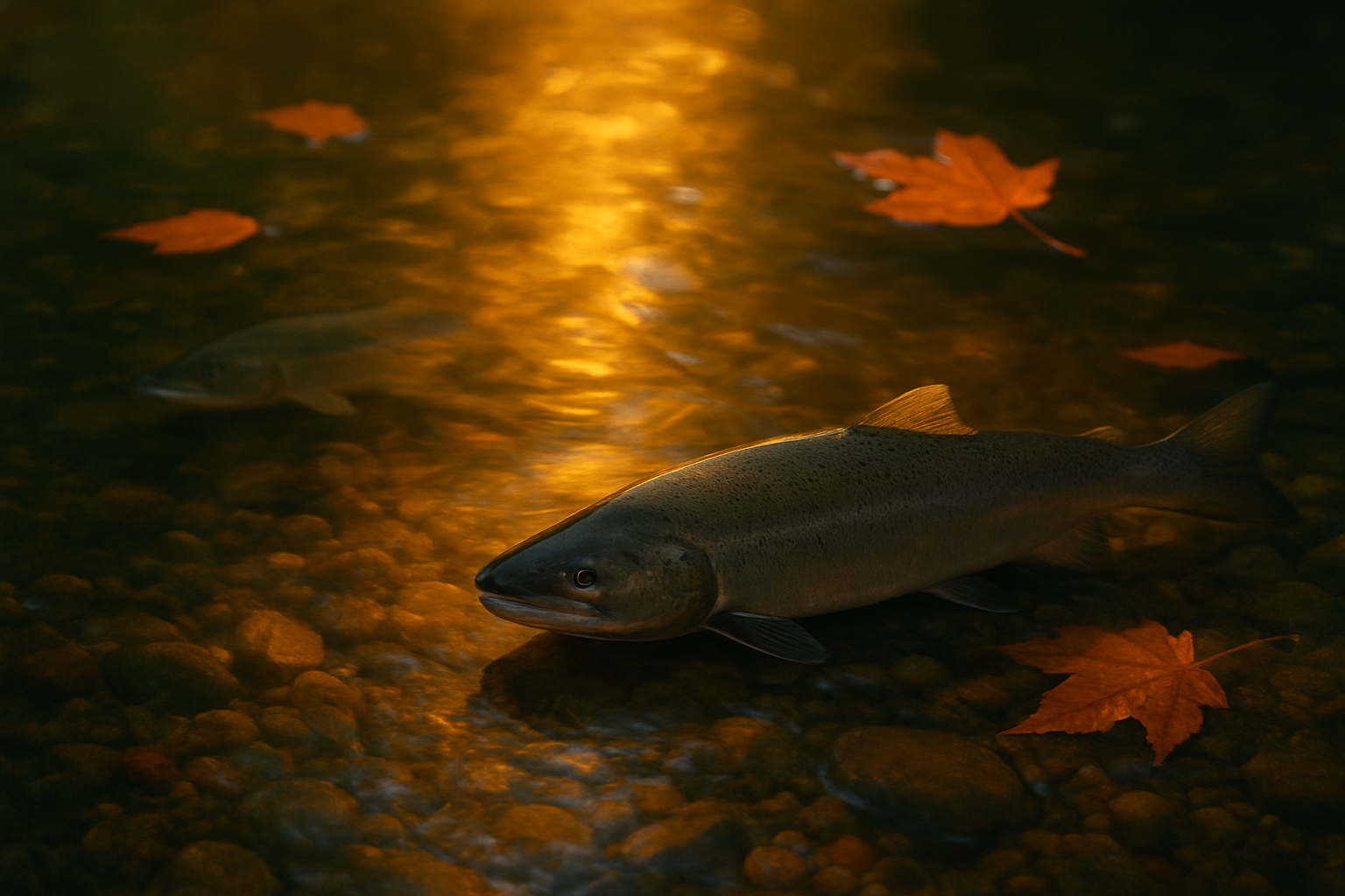秋の川は、低く歌うように流れている。 山からの冷たい水が岩を越え、 木の葉を運びながら、静かに季節を刻む。 その水音の奥に、無数の命の声が重なっている。 それは、鮭の群れが川を遡る音。 命が還る季節の鼓動。