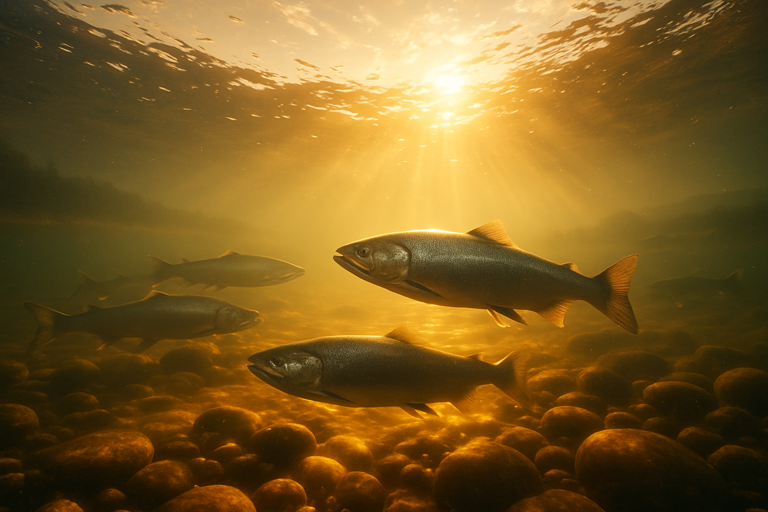 朝の川に光が差し込む。 その粒は、まるで小さな命の残響のように揺れている。 流れの底では、孵化した稚魚が水を感じ、 空を知らぬままに、光の方向を覚えていく。 鮭の旅は、いつも光とともに始まり、光のもとに帰る。