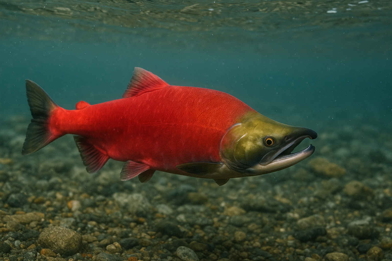 生態:川で生まれ、海へ下り、数年後に紅色の体となって戻る回遊魚。