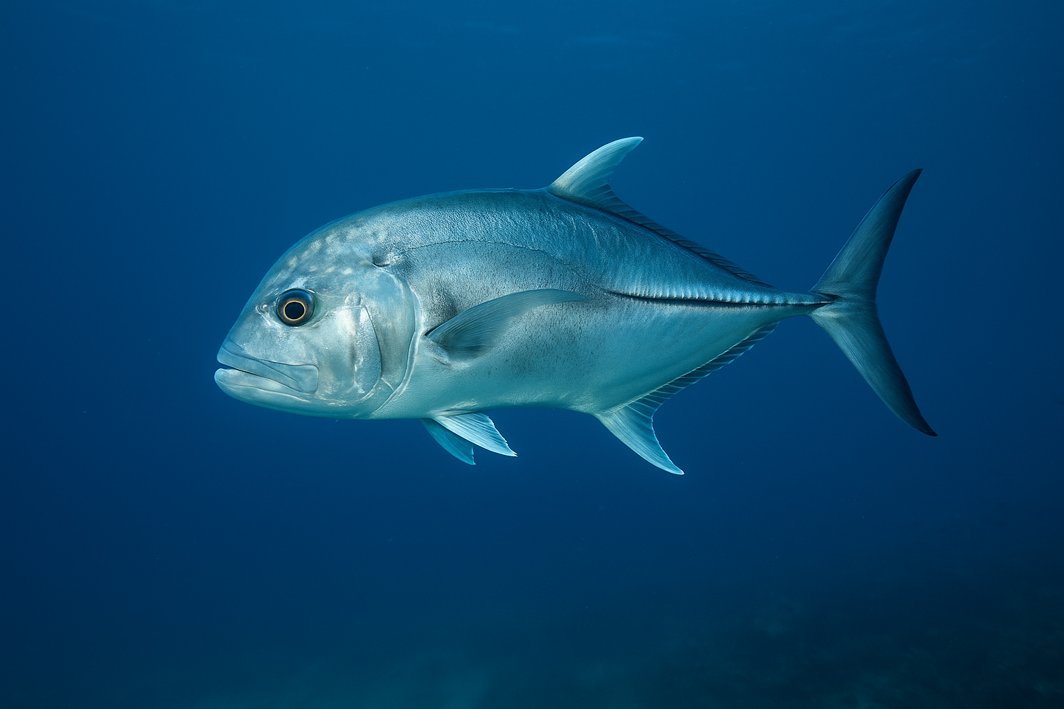 ロウニンアジの体は、銀白色の輝きを放ちながら筋肉質で厚みがあり、まるで金属の彫刻のよう。