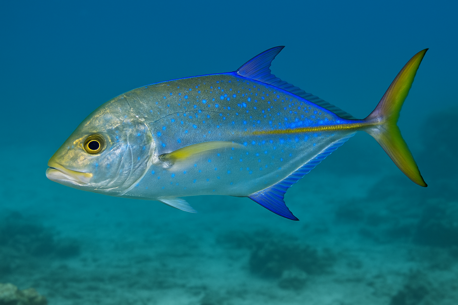 カスミアジの最大の特徴は、体全体を覆う鮮やかな青い光沢と、尾びれ・腹びれに走る黄金色のライン