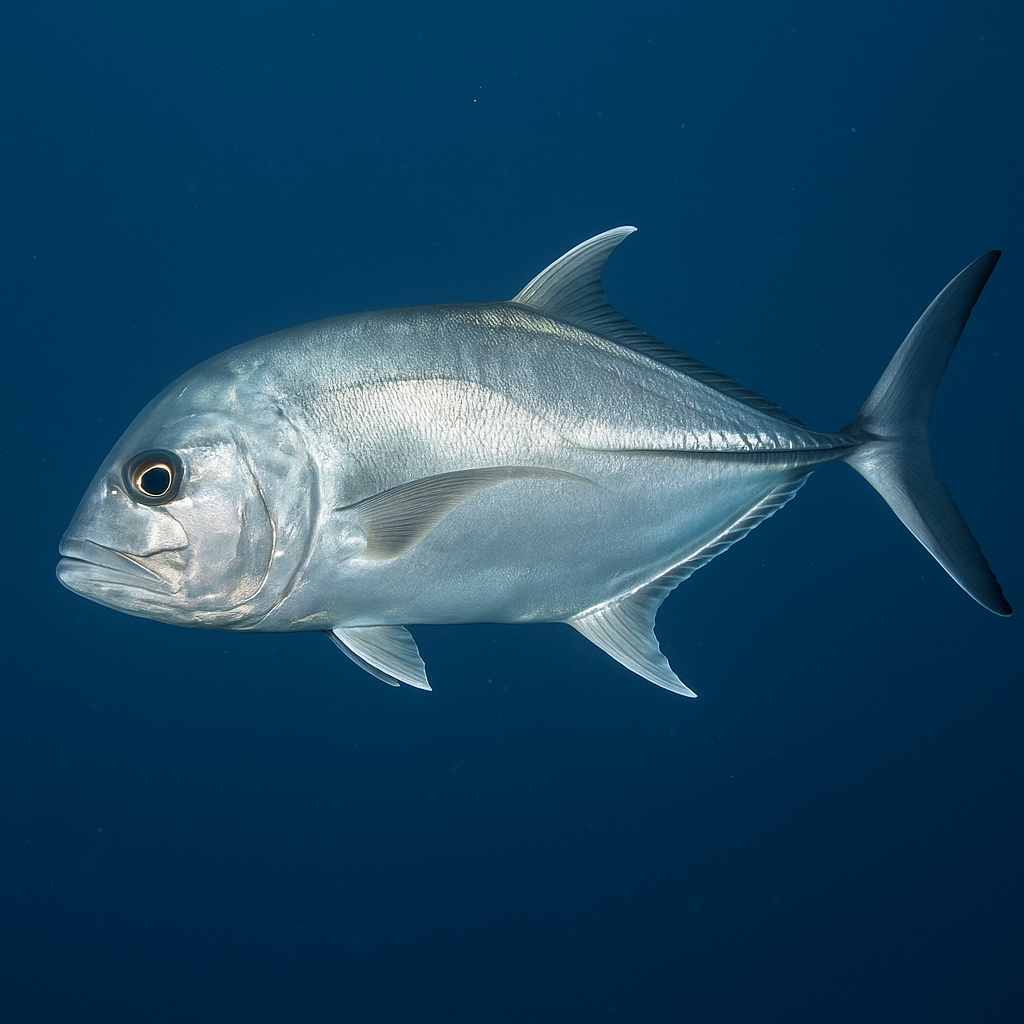 ギンガメアジの最大の特徴は、光沢のある銀色の体表と大きな眼。