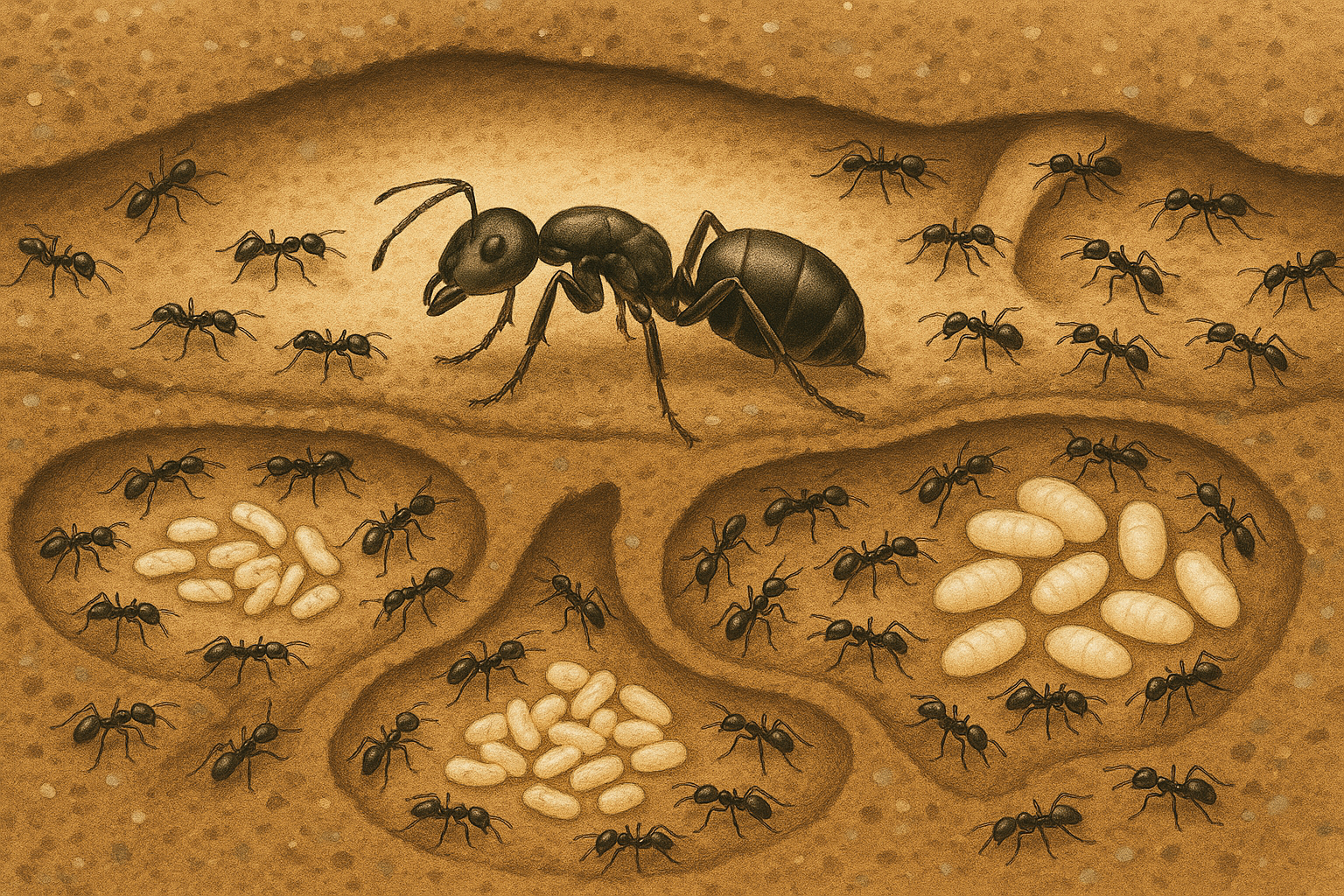 ― 地面の下に広がる巣では、数千から数十万という個体が、驚くほどの秩序を保ちながら生きている。餌を探す者、幼虫を育てる者、巣を守る者、そして新しい世代を生む者。アリの社会は、小さな体の集合が“ひとつの大きな生命”のように機能する世界である。