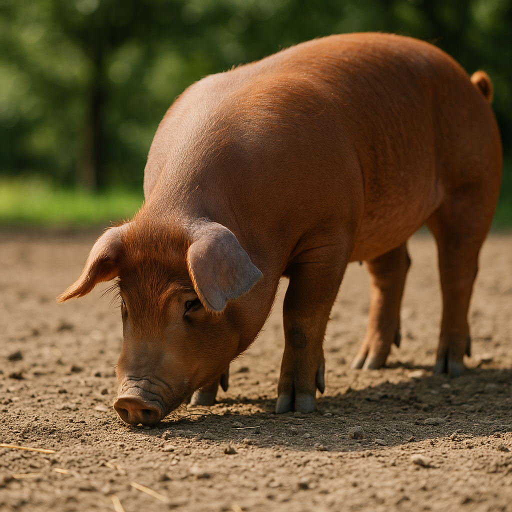 ― 早朝の農場で、ブタが鼻先を土に押しつけるようにして地面を探っている。草の根、落ちた実、虫の気配、土の下のわずかな変化――そのすべてを読み取りながら、一つひとつ確かめるように口へ運ぶ。その姿は、ブタが雑食動物としての高い柔軟性を持つことをよく示している。