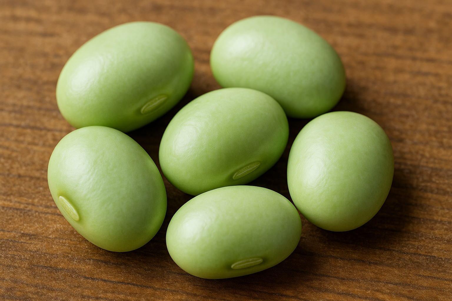 種子: 緑色の種皮・子葉(クロロフィルを保持)、大粒〜中粒