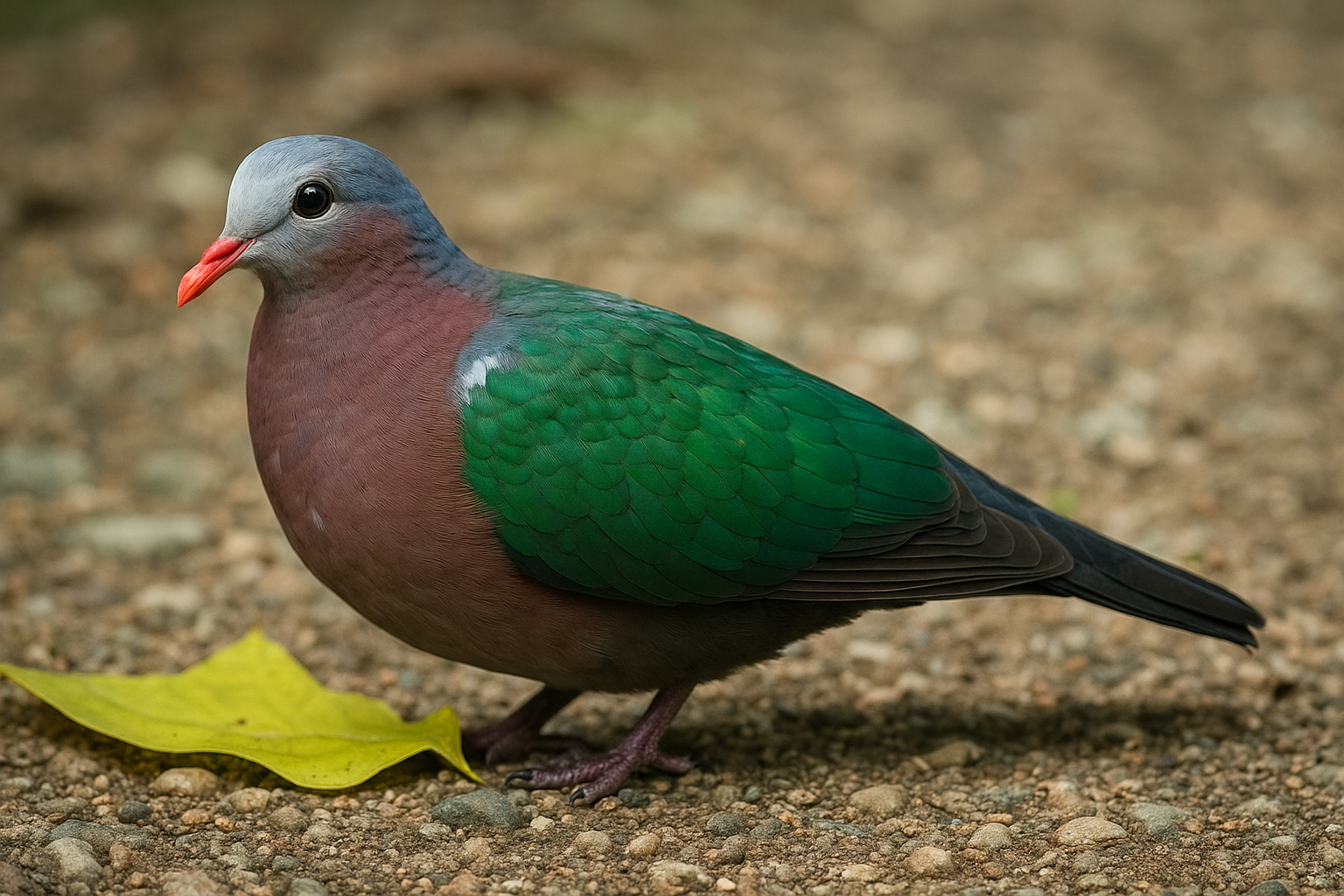 ― 森の薄暗い地面を歩くと、落ち葉のあいだから突然、宝石のような緑や赤がちらりと光ることがある。キンバトやベニバト類の姿だ。体は小さく控えめなのに、その羽に宿る色は見た者の記憶に強く残る。南方の森が育てた“小さな宝石”と呼ぶのがふさわしい。