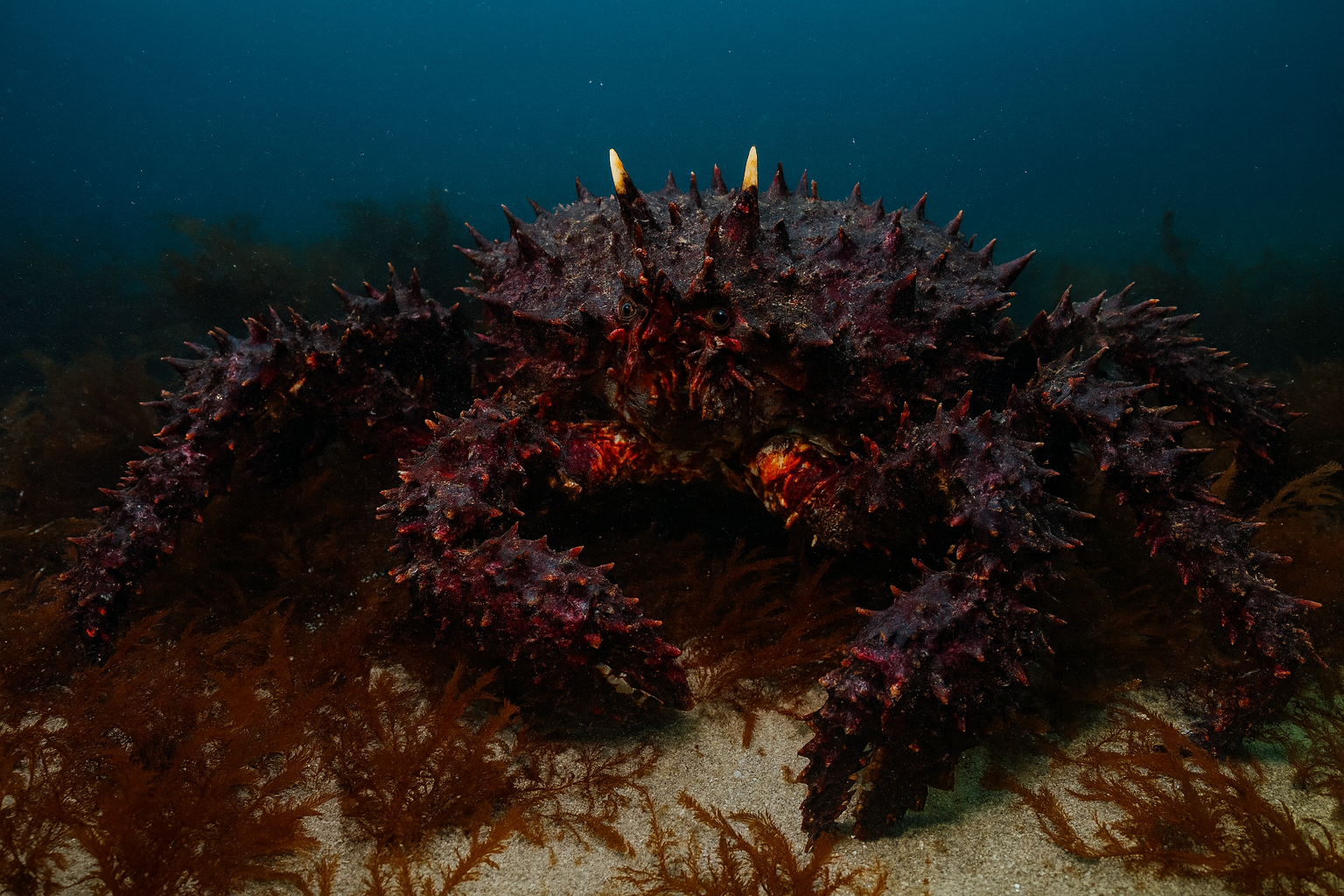 ― 深い海の冷たさをまとった赤い殻が、棘を光らせながらゆっくり歩く。ハナサキガニは北海道周辺に多い大型のカニで、鋭いトゲと強い脚、濃い赤色が特徴の“北の海”を象徴する存在だ ―