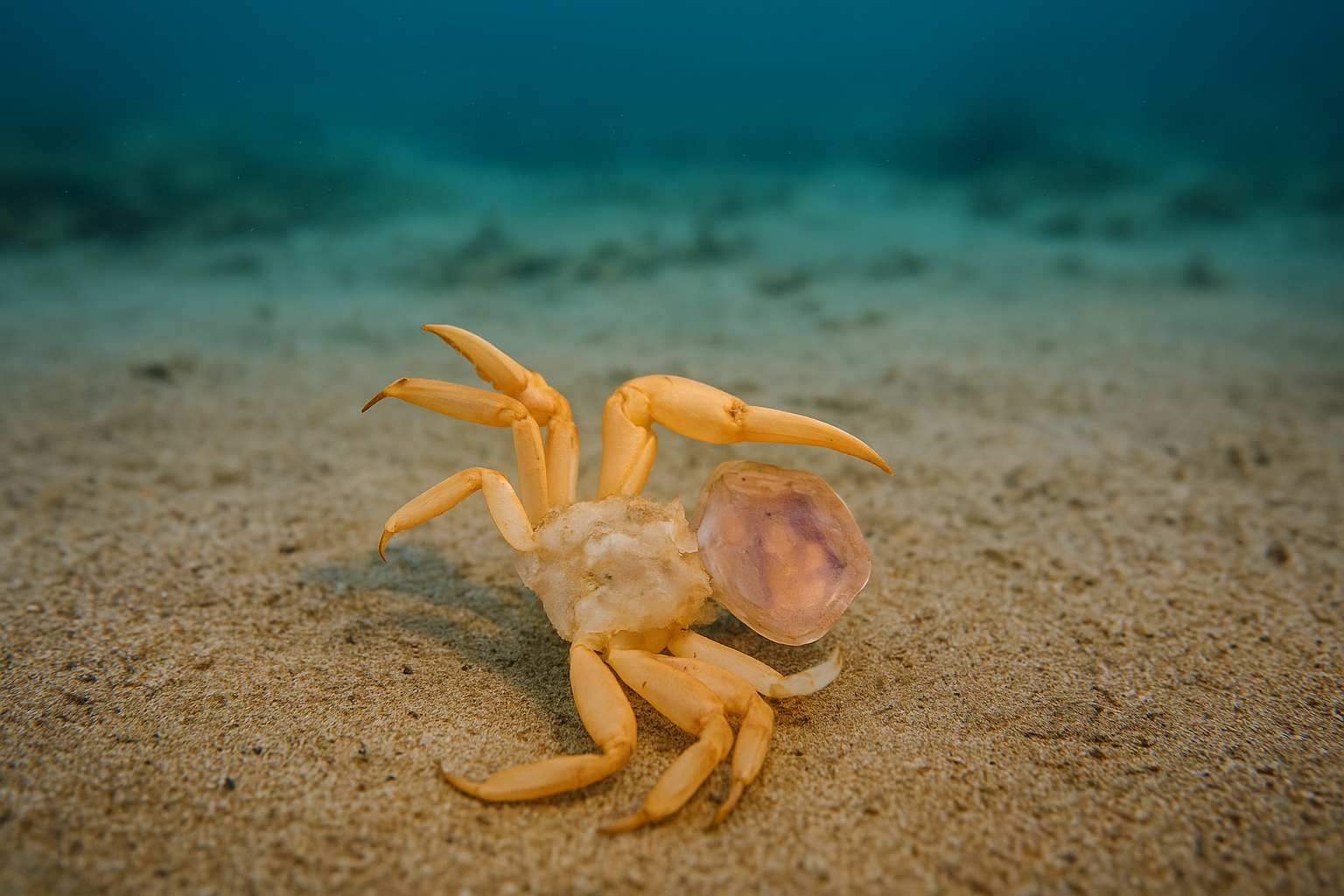 静かな海底でひとつの殻がほどけ、新しい体がそっと砂に触れる。