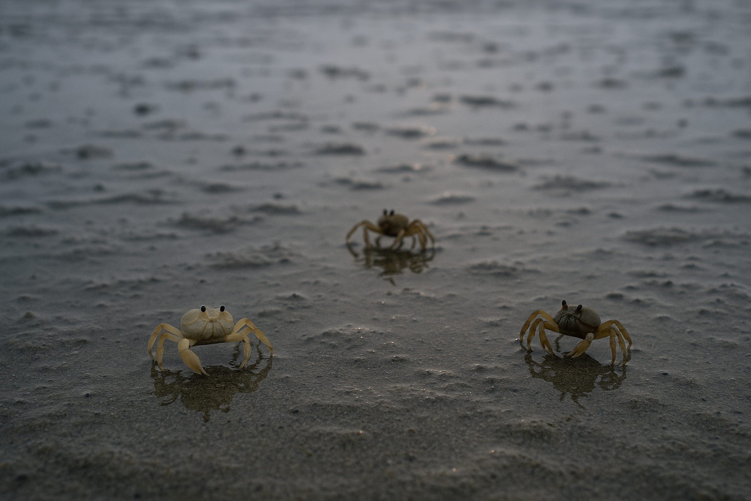 ― 潮が静かに引くと、砂の表面に細かい穴が現れる。風が干潟を渡るたび、そこから小さな影が動き出す。干潟は、カニにとって餌と隠れ場所が集まる“動きやすい時間”をつくる場所だ ―