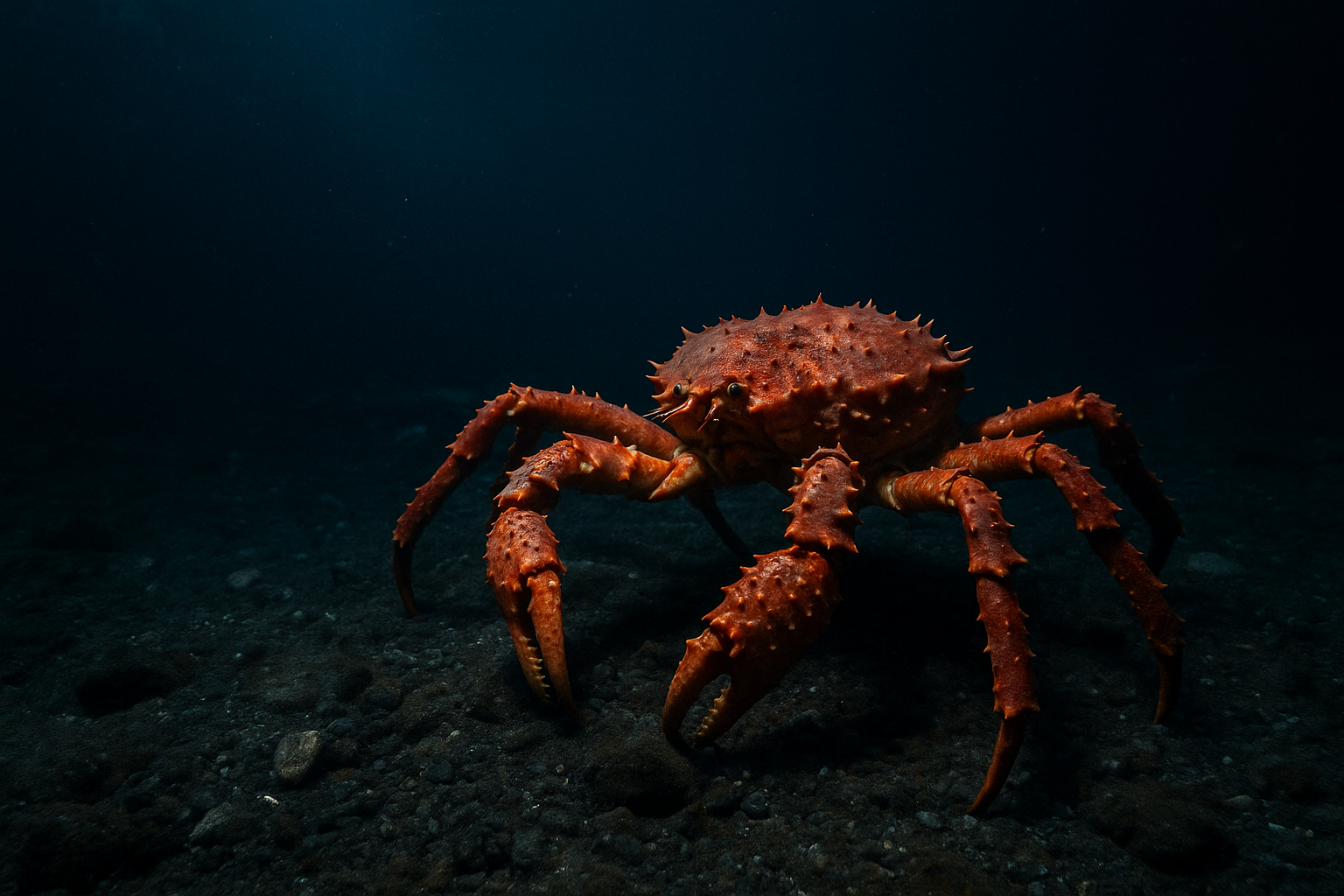 ― 「カニ」の名がついていながら、実はカニではない。タラバガニはヤドカリの仲間で、独特の体つきと大きな甲羅をもつ大型甲殻類だ。北の深い海を歩きながら暮らし、その姿と文化的な知名度から“海の王”として親しまれている ―