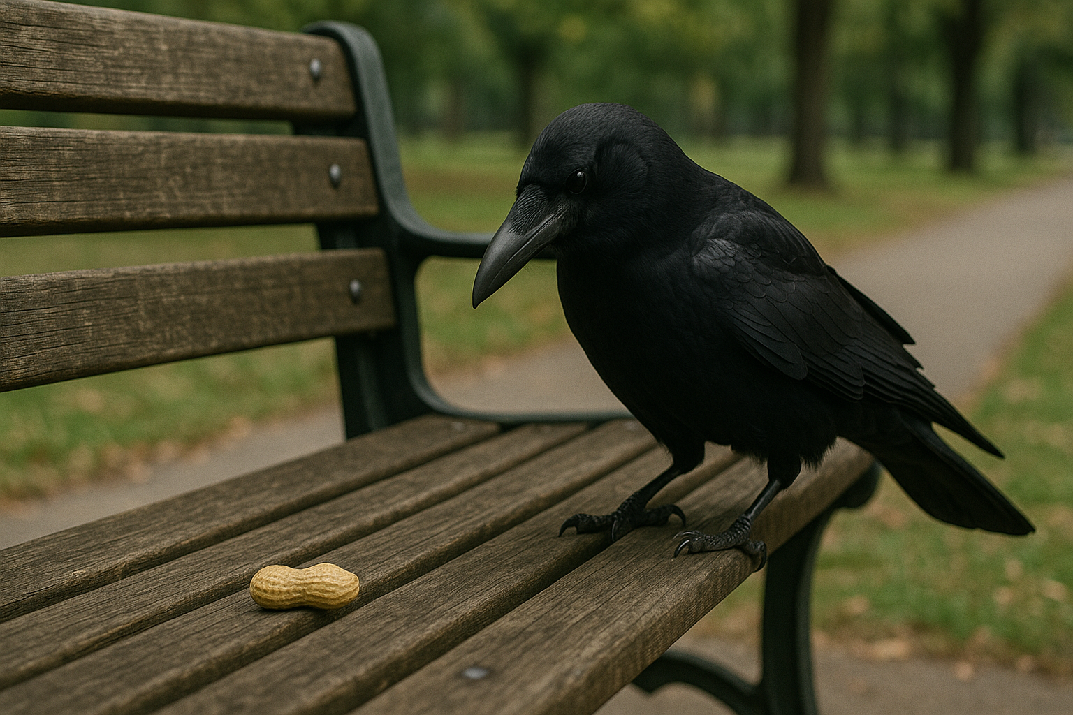 一羽のカラスが、公園のベンチに落ちたピーナッツをくちばしで転がす。