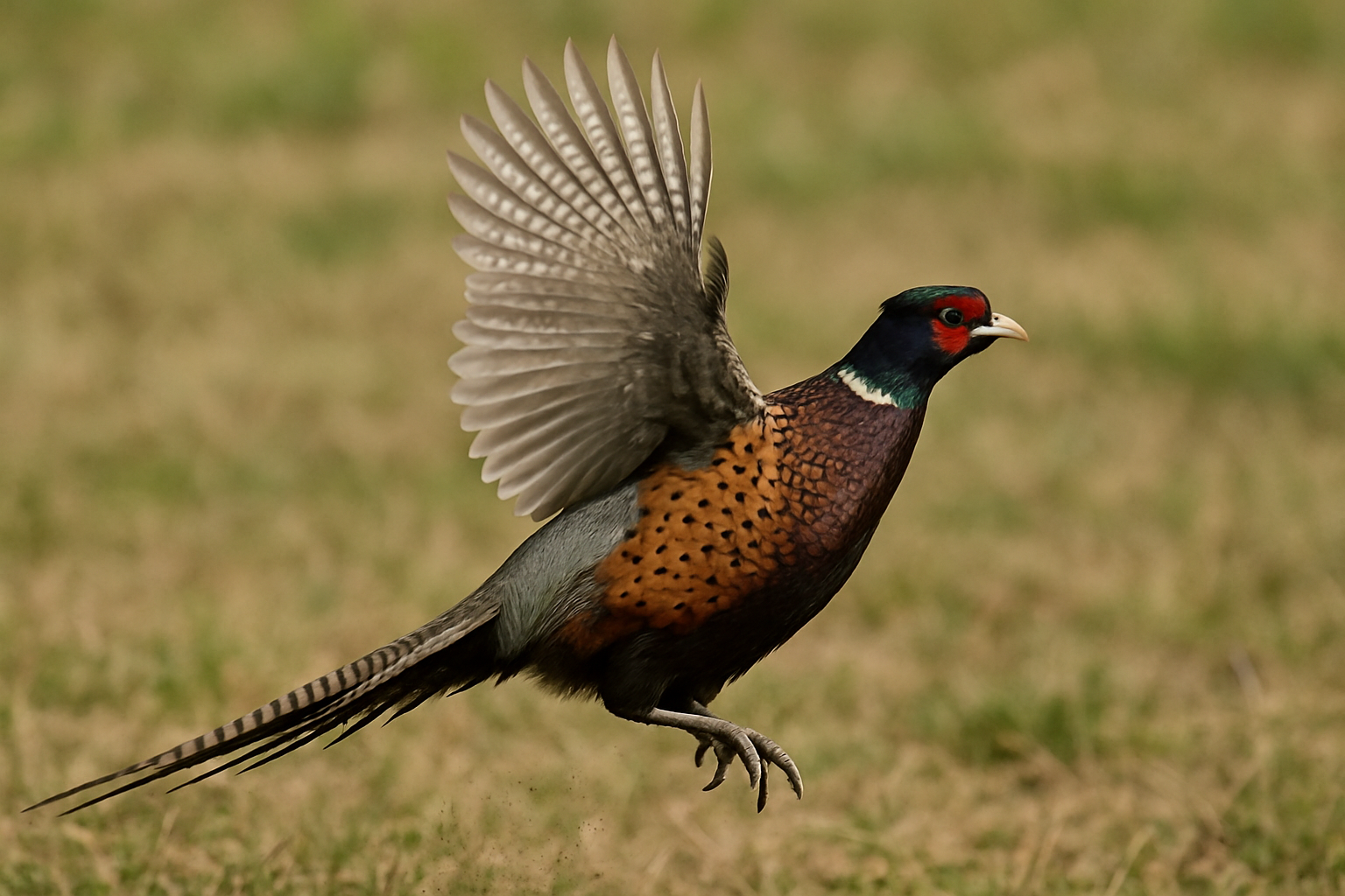 キジは長距離を飛ぶ鳥ではない。代わりに“瞬発力”に特化している。地上から一気に跳び上がり、短距離を力強く羽ばたいて距離を取るのが主な飛び方だ。