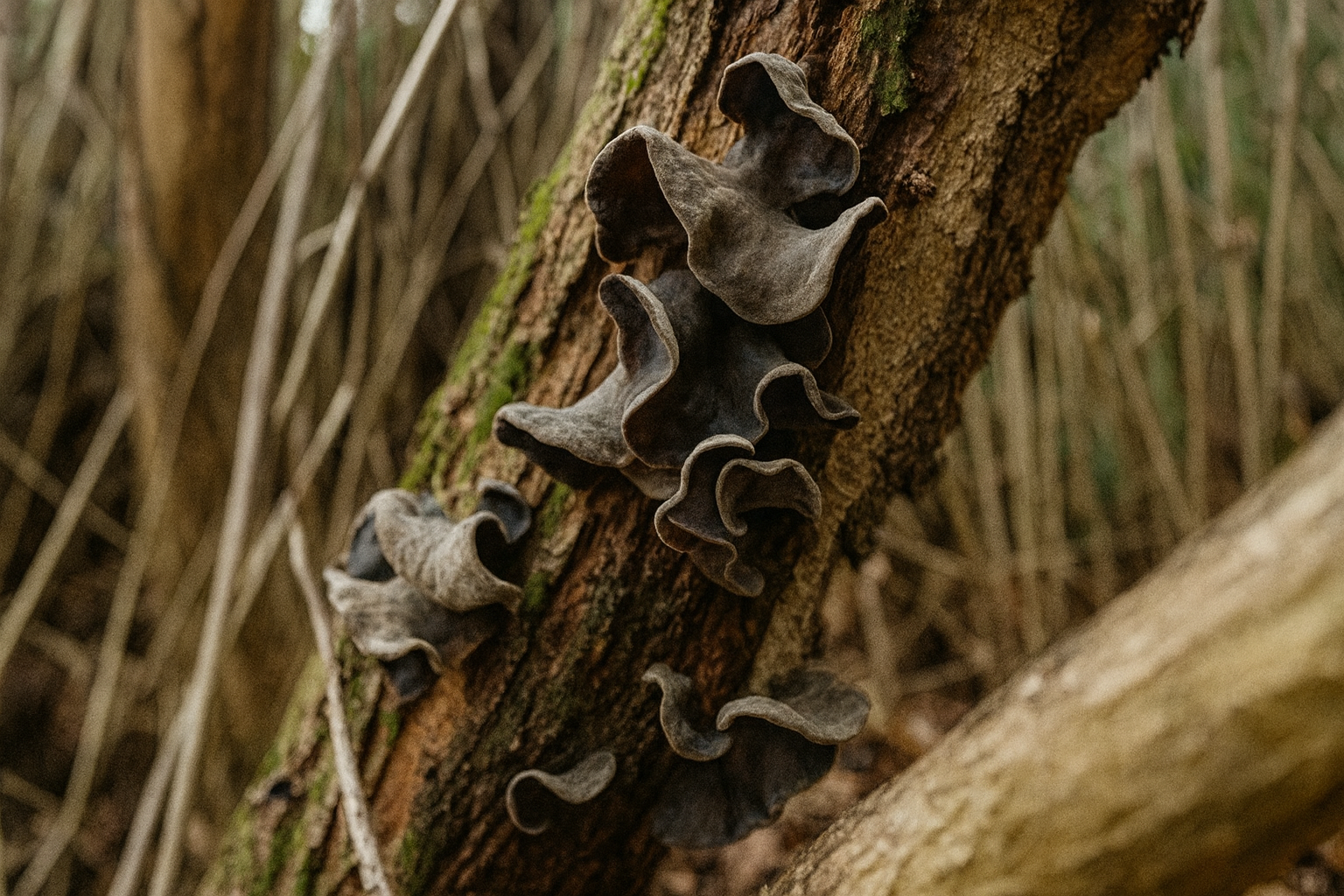 キクラゲは、木の幹にそっと耳を当てているような形をしている。