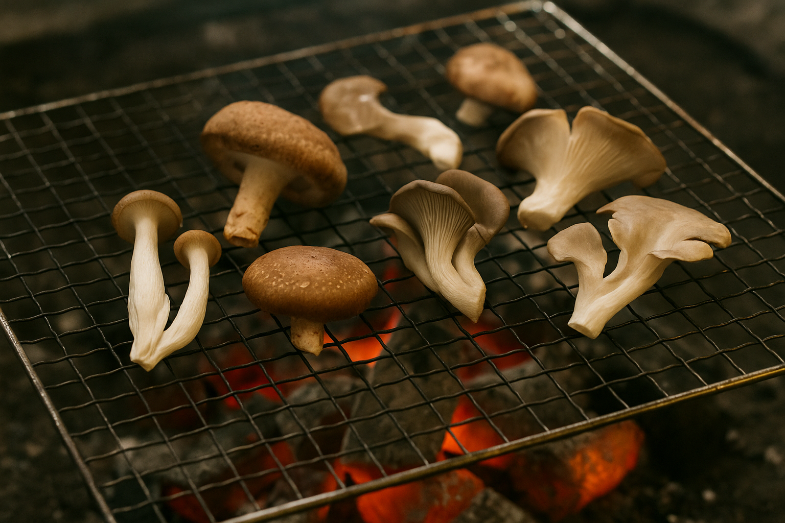 焼きシイタケ、焼きマツタケ、網焼きナメコ。