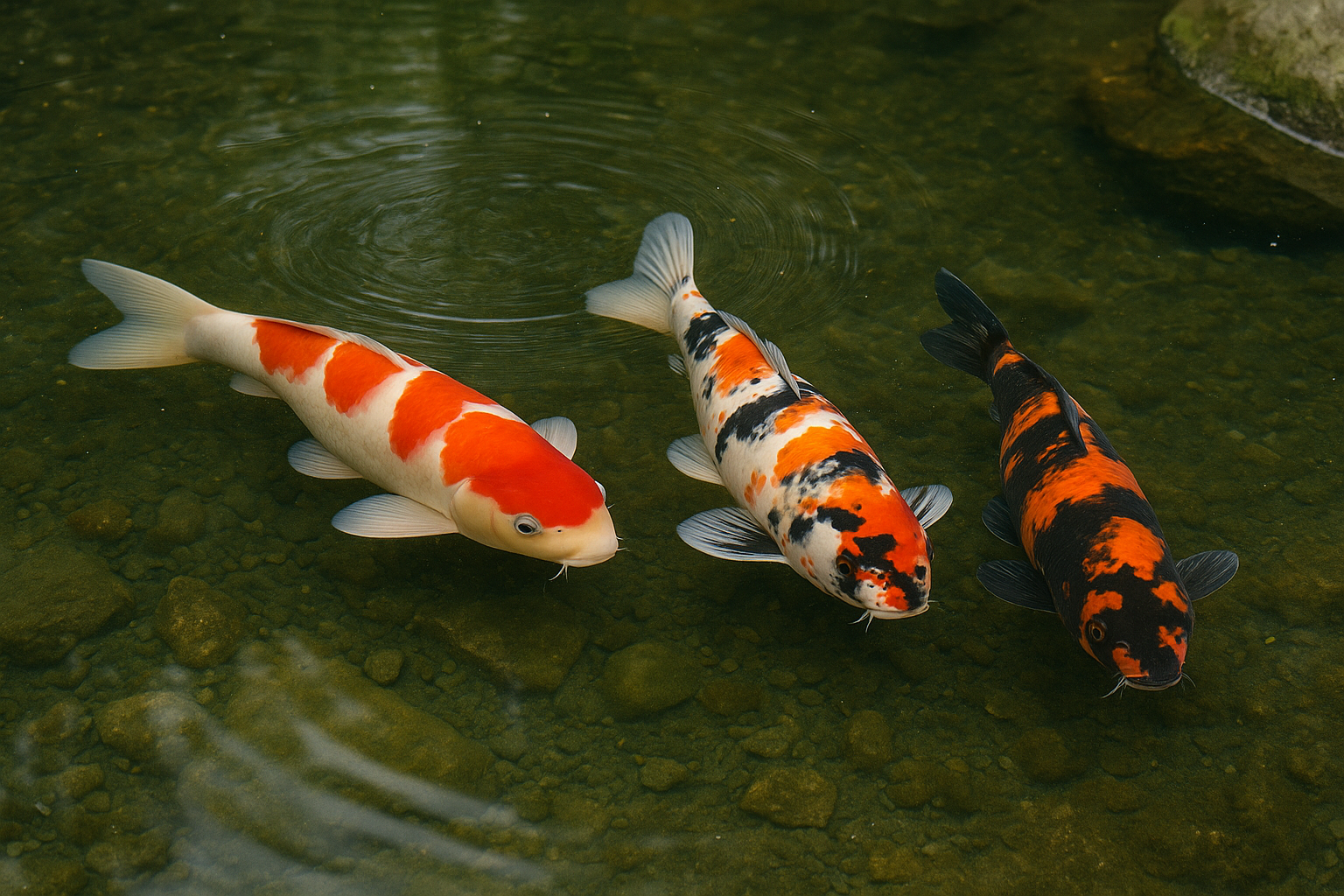 錦鯉の基盤はCyprinus carpioだが、体色変異を重ねて選抜された結果、現在の多彩な品種群が生まれた。なかでも紅白・大正三色・昭和三色は「御三家」と呼ばれ、錦鯉文化を語るうえで欠かせない存在である。色、模様、そして配置――すべてが鑑賞価値を決める重要な要素だ。