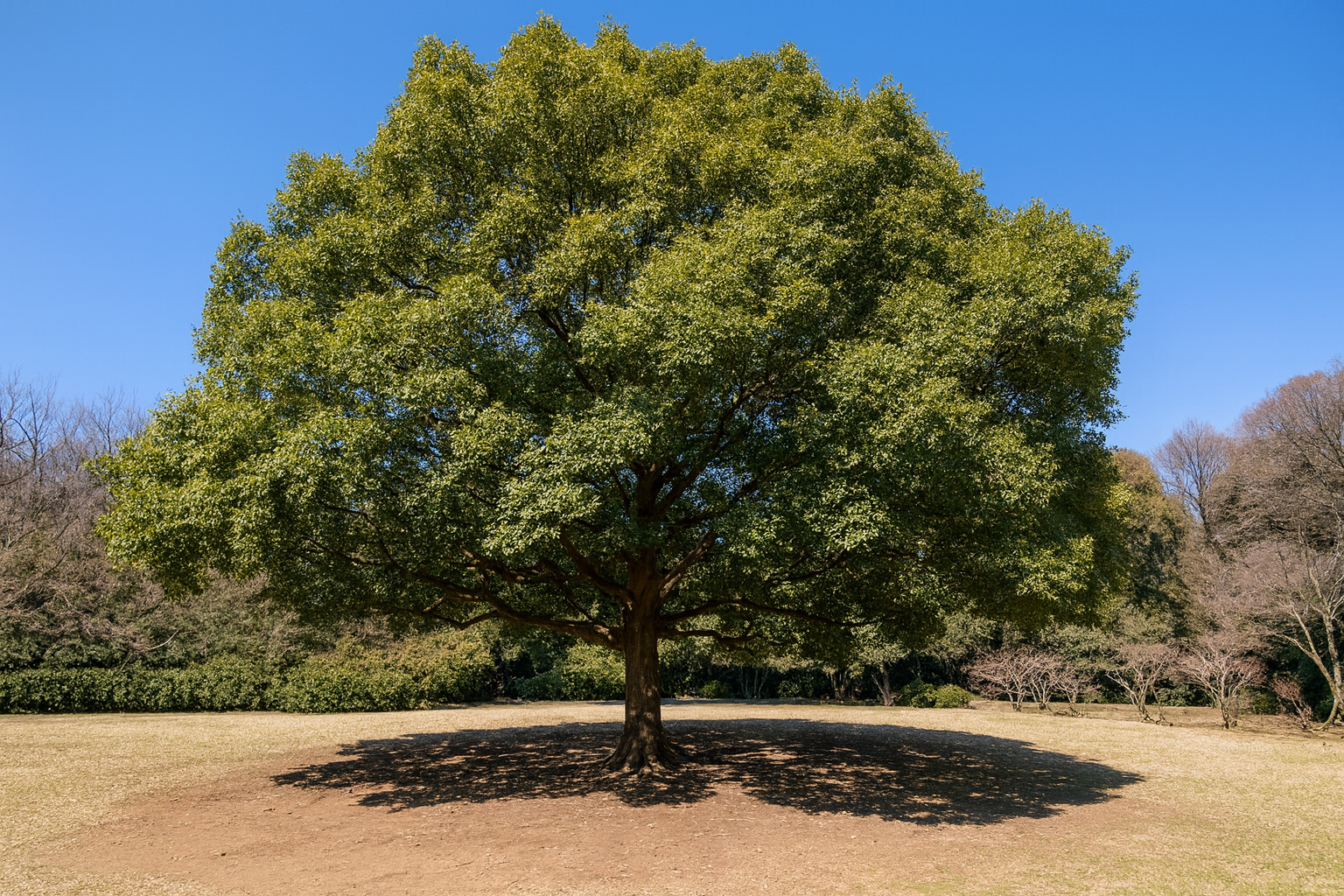 シラカシは、細長く艶やかな葉をもつ常緑の樹。