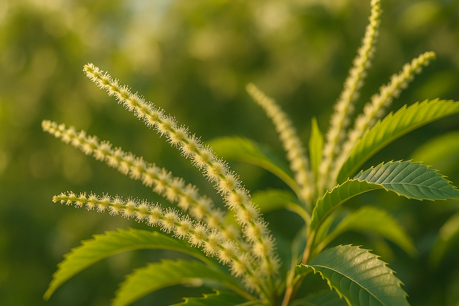 初夏、長い穂のような雄花が風に揺れ、森に香りを放つ。