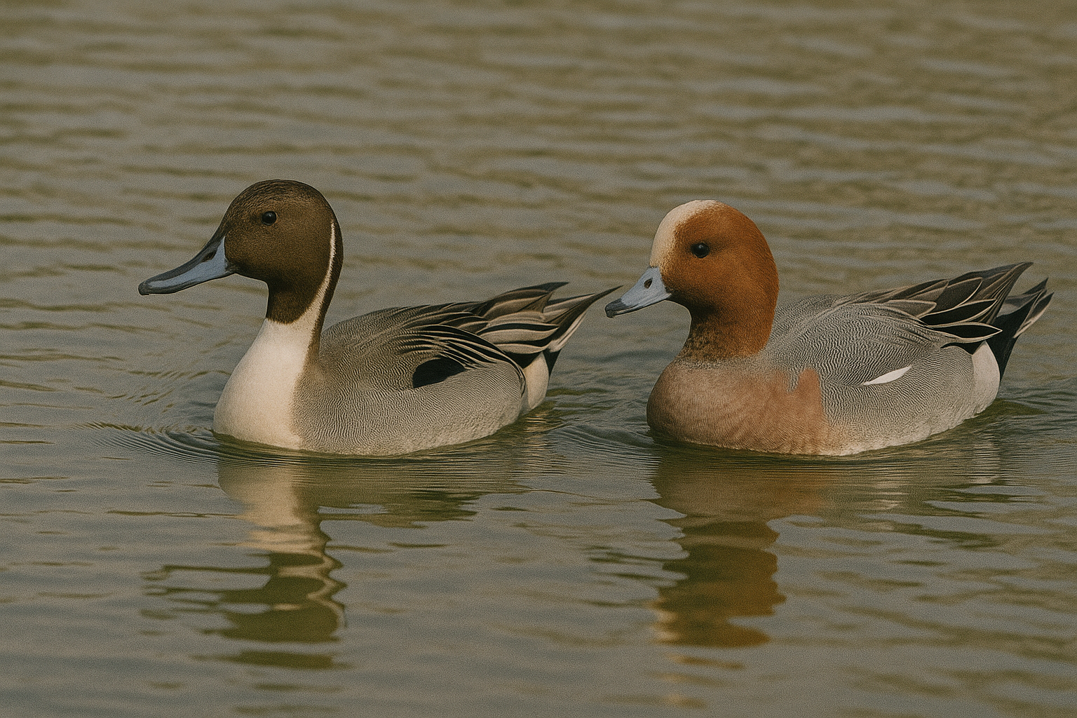 冬の池で最も目を引く二種のカモ――オナガガモとヒドリガモ。