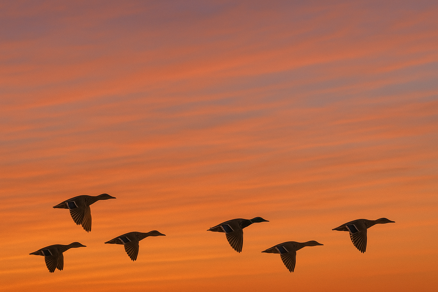 マガモの群れが空を切り、風を分け合うように飛ぶ。