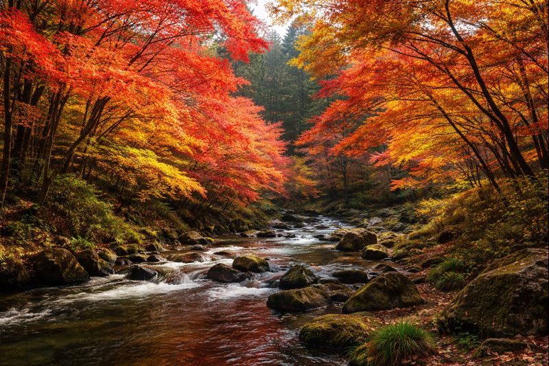 モミジの名所は、風景が歩く人を迎えに来る場所だ。