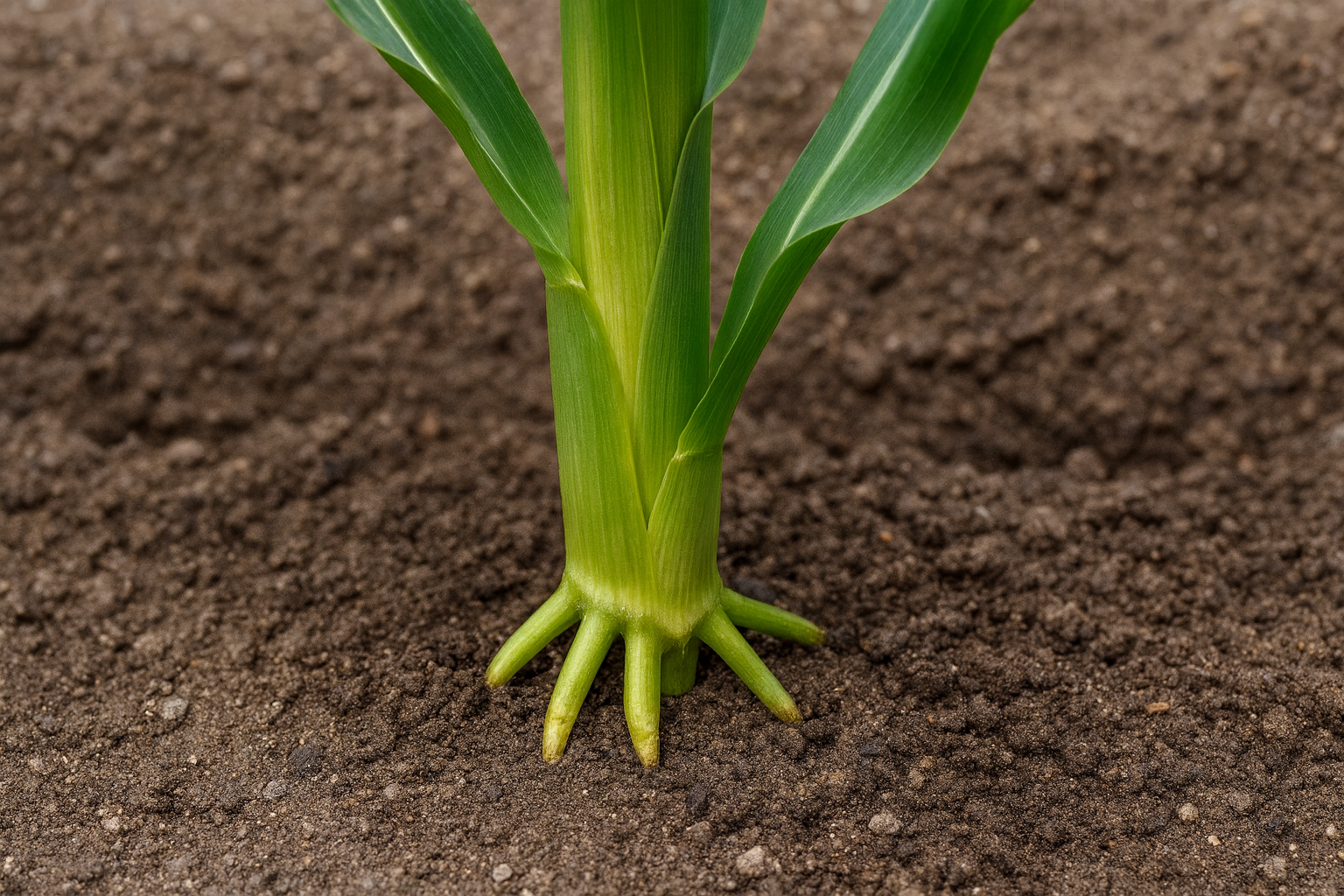 トウモロコシの根は、見た目以上に大地の深くへ入り込み、縦にも横にも広がる。乾燥に強い理由の多くは、この“根のネットワーク”にある。