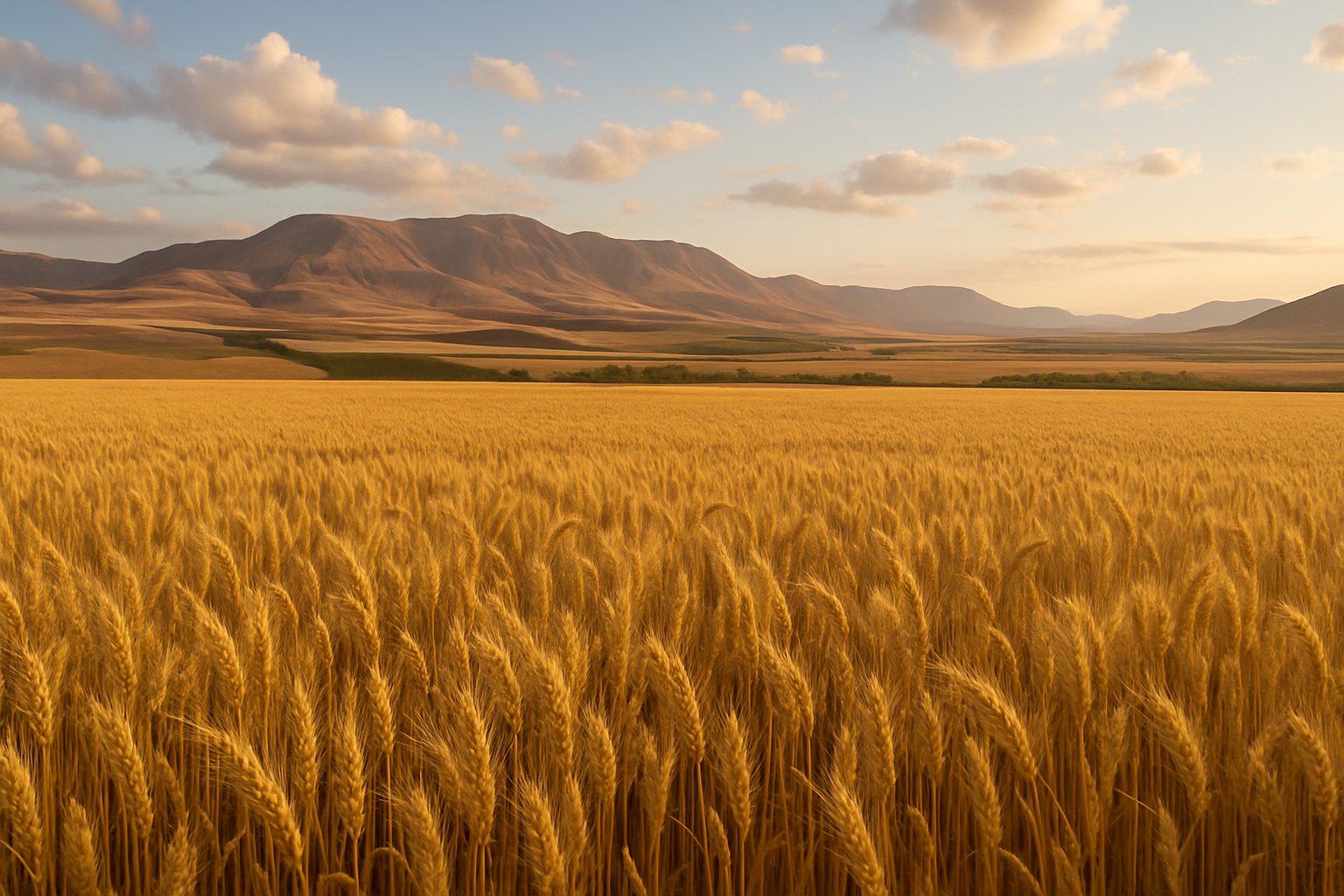 雨の少ない丘陵に野生の麦が広がり、