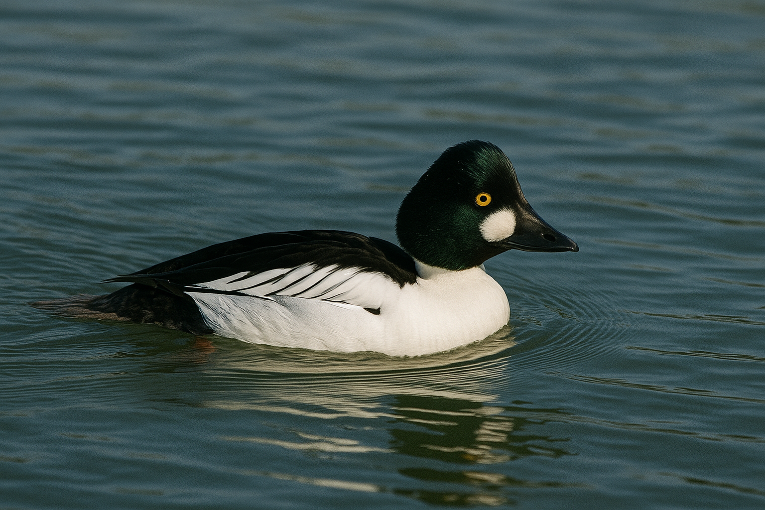 それは風でも水でもない。 羽が空気を切る音――ホオジロガモの羽音だ。 冬の朝、薄氷の湖面をわずかに割って飛び立つ姿は、 静寂の中の生命そのもの。 金色の瞳が、森の光を映していた。