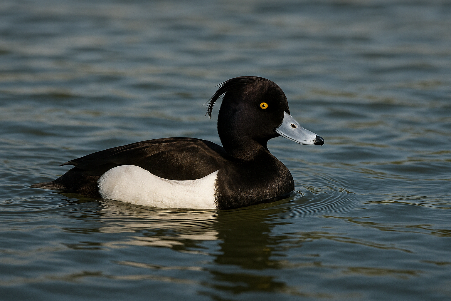 風のない朝。 湖面の奥から、黒い影が浮かび上がる。 キンクロハジロ――黄金の瞳をもつ小さな潜水ガモ。 水面を滑り、波間に沈み、再び姿を現す。 その動きは、まるで光と水が語り合うようだ。