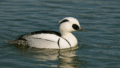 オスの黒と白のコントラストは、潜水ガモの中でも特に鮮やか。 後頭部の長い冠羽が特徴的で、風に揺れる姿は優雅そのもの。 目は濃い金色に輝き、遠くからでも印象的だ。