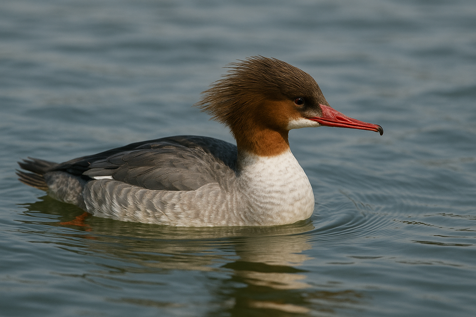カワアイサは、潜水ガモの中でも特異な存在。 湖よりも川を好み、流れの中で泳ぎながら魚を追う。 長い体と鋭い嘴は、その狩りに特化した道具。 透明な流れの中をすべるように進み、 獲物を見つけると一瞬で水中へと沈む。