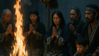 アイヌの熊送り「イヨマンテ」。火と歌、祈りと涙。熊を神として見送り、山と人が再び結ばれる儀式を描く。