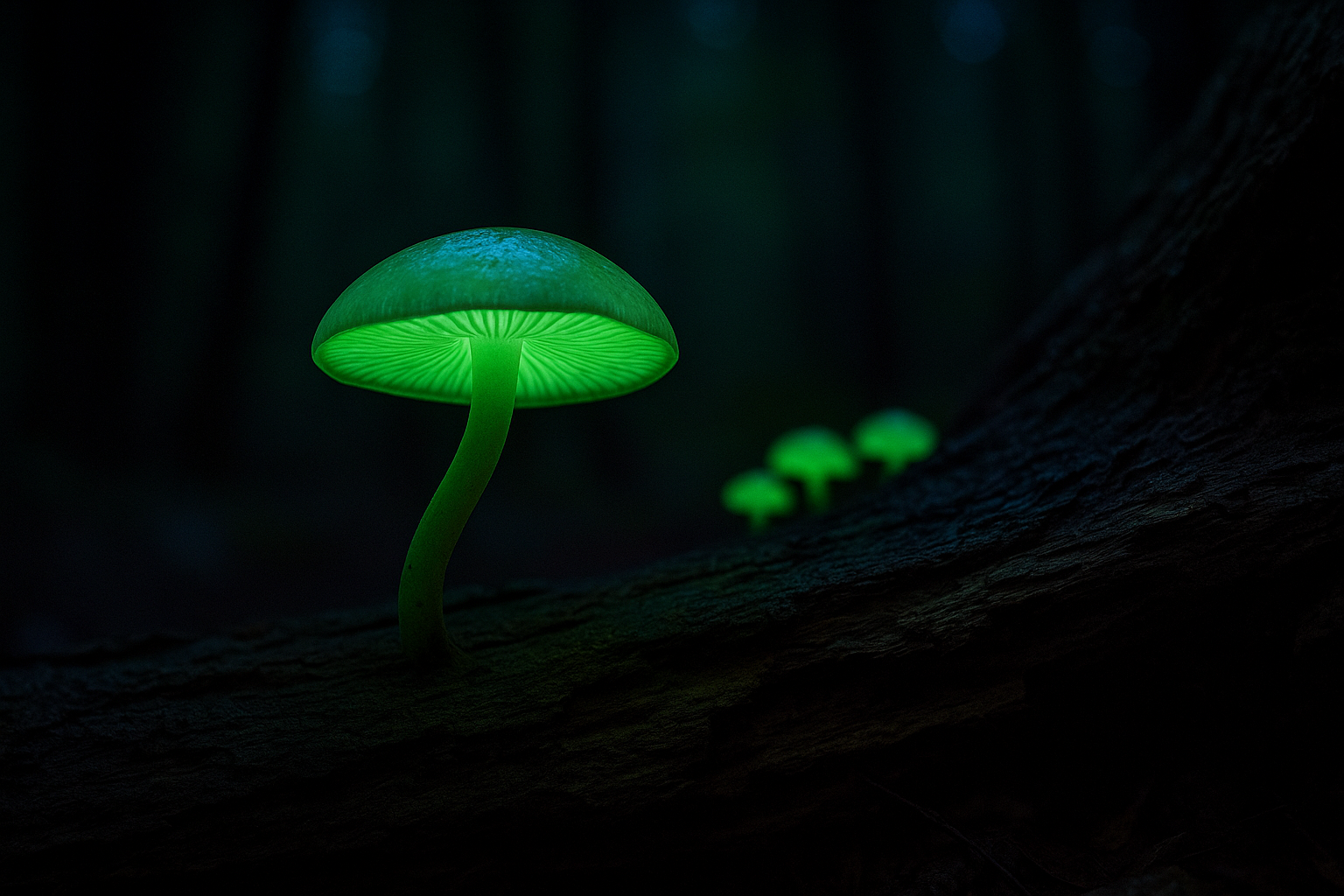 夜の森に光るきのこ、ヒカリタケやヤコウタケ。朽ちた木を照らすその光は、命の記憶。科学と詩のあいだにある静かな美を描く。