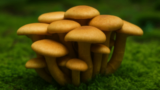 黄金色に輝く毒きのこ、オオワライタケ。幻覚性の毒が人の意識をゆらし、森の深層を見せる。毒と神の境界に立つ存在を描く。