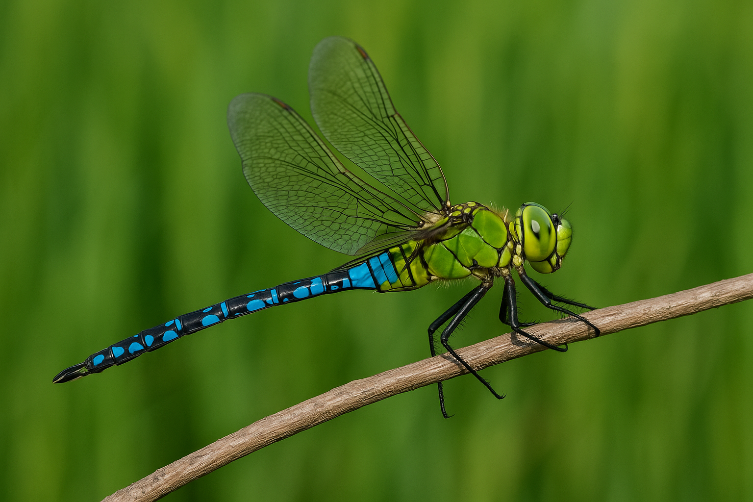 体は深い緑色で、腹部には青い帯が穏やかに続く。