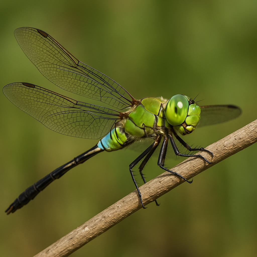 ギンヤンマは、胸部が鮮やかな緑、腹部は青と黒の帯が入る。