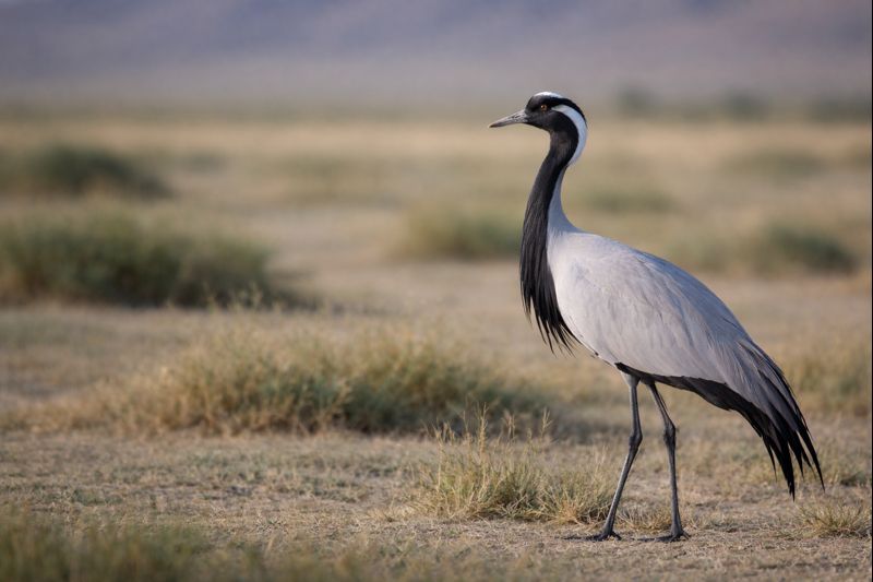 乾いた草原に、背の高い影が立つ。湿地に集まるツルとは違い、ここには水の気配が少ない。風に揺れる草のあいだを、ゆっくりと歩くその姿は、ツルという鳥が必ずしも水辺だけの存在ではないことを静かに示している。