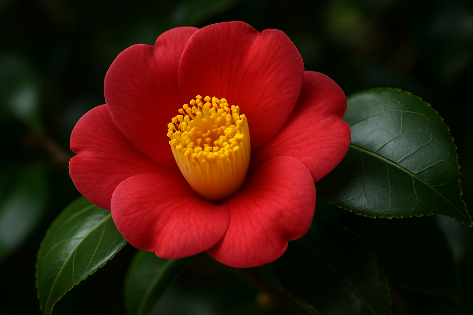 ・ツバキ :大ぶりの葉、多彩な花色(白・紅・絞り)