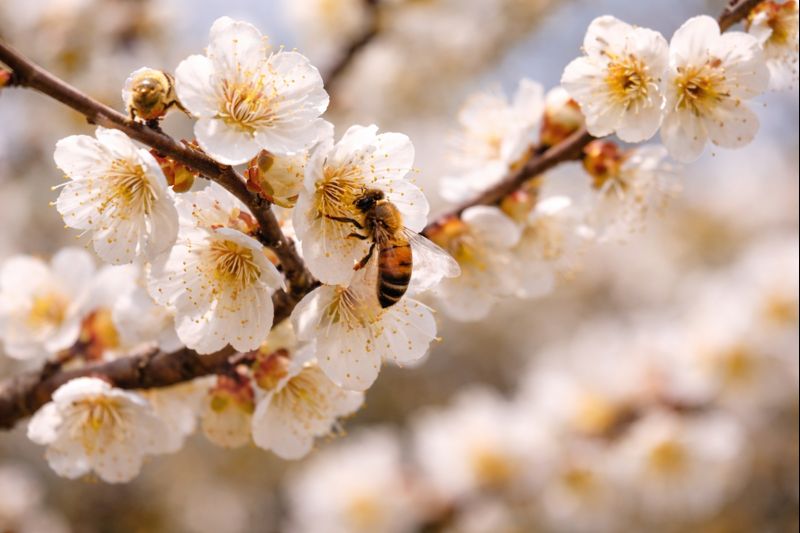 ウメの花は、早春に活動する昆虫によって受粉される。ミツバチやハナアブなど、限られた受粉者が頼りだ。