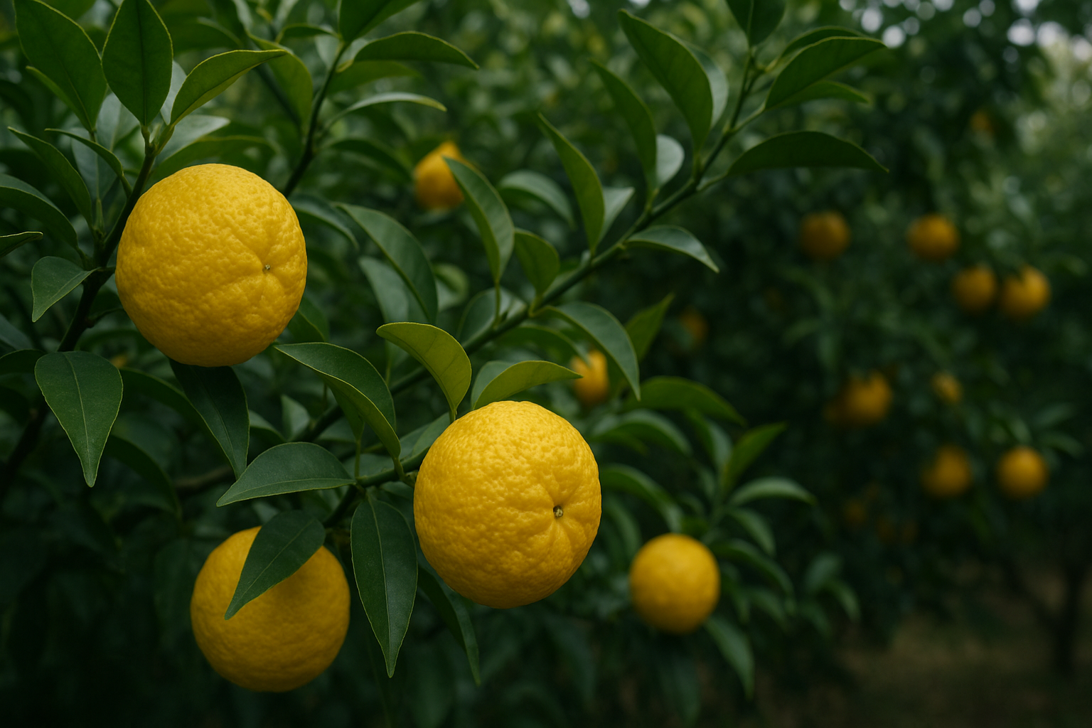 初夏に白い五弁花を咲かせ、秋に果実が黄熟する。 果皮表面には無数の油胞が並び、そこに香りの成分が詰まっている。 主要成分はリモネン、シトラール、γ-テルピネン。 冬の寒さで果皮の水分が減ると精油濃度が上がり、 その香りはいっそう澄んで感じられる。